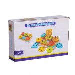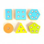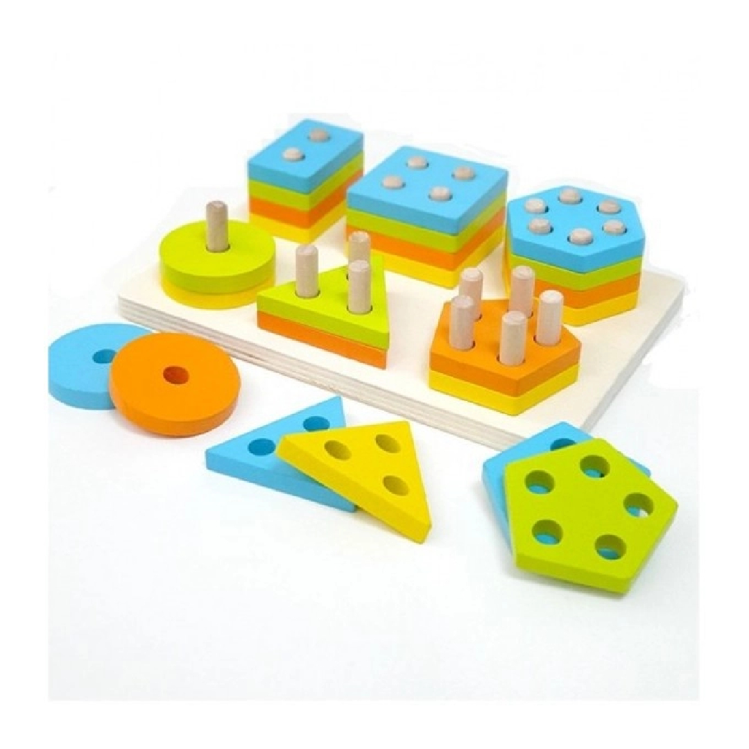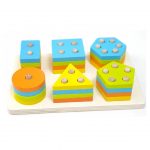 Набор содержит деревянную опору и 24 геометрические фигуры, по 4 каждого типа, красиво раскрашенные.